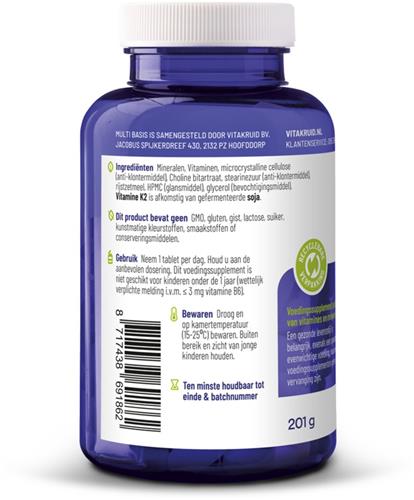 Vitakruid Multi Basis Tabletten is een hoogwaardige multivitamine die alle essentiële voedingsstoffen bevat in de best opneembare vormen wereldwijd. Met slechts één tablet per dag voorziet dit supplement in al uw dagelijkse behoeften. Het bevat onder andere foliumzuur en vitamine B12 voor extra energie, vitamine C, ijzer, selenium en zink voor een sterke weerstand, en calcium en vitamine D voor gezonde spieren en botten. Bovendien is het product glutenvrij en lactosevrij, waardoor het geschikt is voor veel verschillende dieetwensen.