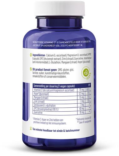 | Ingrediënten | Calcium (L-ascorbaat), Magnesium (L-ascorbaat), hypromellose (capsule), OPC (druivenpit extract), Zink (citraat), Quercetine, magnesium stearaat (anti-klontermiddel), L-Glutathion, Mangaan (citraat), Koper (gluconaat), silicium dioxide (vulstof). |