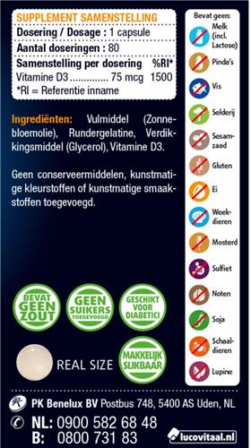 - Bij Bol.com kun je 3x Lucovitaal Vitamine D3 75mcg Forte 80 capsules kopen voor de prijs van € 29,99. Dit is vandaag de goedkoopste webshop.
