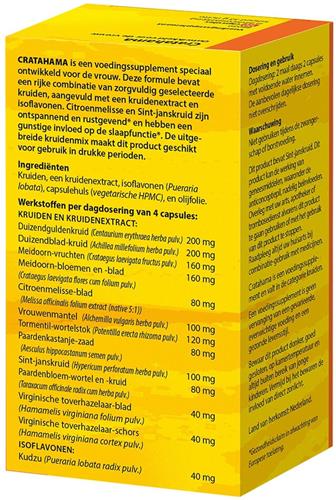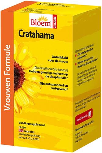 Bloem Cratahama Extra Forte is een voedingssupplement speciaal ontworpen voor vrouwen. Deze formule bestaat uit een combinatie van kruidenextracten, waaronder isoflavonen en st. Janskruid. Let op, dit supplement bevat Sint-Janskruid en mag niet worden gebruikt zonder overleg met een arts of apotheker, vooral niet in combinatie met andere geneesmiddelen of anticonceptie- of morning-afterpil. Ook is het niet geschikt voor kinderen onder de 12 jaar, zwangere vrouwen of vrouwen die borstvoeding geven.