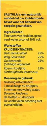 | Ingrediënten | SamenstellingBerk (Betula alba)25%Wilg (Salix alba)25%Guldenroede (Solidago virgaurea)25%Koemis koetjing (Orthosiphonis stamineus)25% IngrediëntenTincturen van kruiden, gezuiverd water, alcohol 50% vol. |