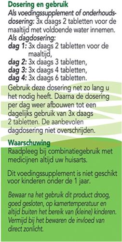 | Gebruiksaanwijzing | Onderhoudsdosering: 3 maal daags 2 tabletten voor de maaltijd met voldoende water innemen, tenzij anders voorgeschreven door arts of therapeut. Als dagdosering: dag 1: 3 maal daags 2 tabletten voor de maaltijd, dag 2: 3 maal daags 3 tabletten, dag 3: 3 maal daags 4 tabletten, dag 4: 3 maal daags 6 tabletten. Gebruik deze dosering net zo lang als u het nodig heeft. Daarna de dosering per dag weer afbouwen tot een dagelijks gebruik van 3 maal daags 2 tabletten. De aanbevolen dagdosering niet overschrijden. |