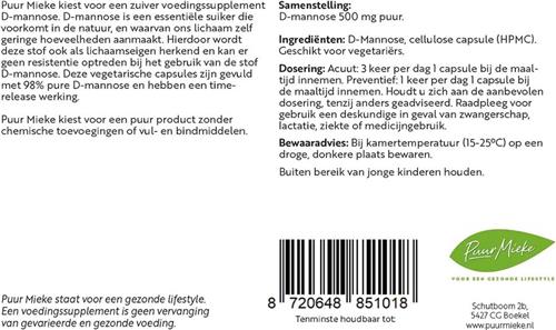 Ontdek de voordelen van Puur Mieke's D-Mannose capsules van 500 mg, met 90 capsules per potje. D-Mannose is een natuurlijke suiker die kan helpen bij het behoud van een goede blaas- en urineweggezondheid. Het wordt gewonnen uit beuken- en berkenhout en komt ook voor in bessen en verschillende fruitsoorten. De capsules bevatten geen vulstoffen of bindmiddelen en zijn geschikt voor vegetariërs en mensen die een koosjer dieet volgen.