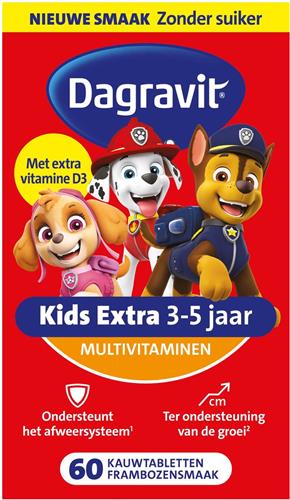 - Bij Bol.com kun je Dagravit Kids Extra 3-5 jaar Multivitaminen - Paw Patrol - Ondersteunt het afweersysteem (1) - Ter ondersteuning van de groei (2) - Frambozensmaak - Suikervrij - 60 kauwtabletten kopen voor de prijs van € 9,69. Dit is vandaag de goedkoopste webshop.