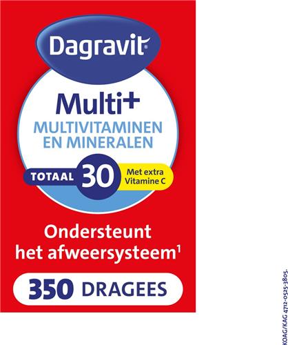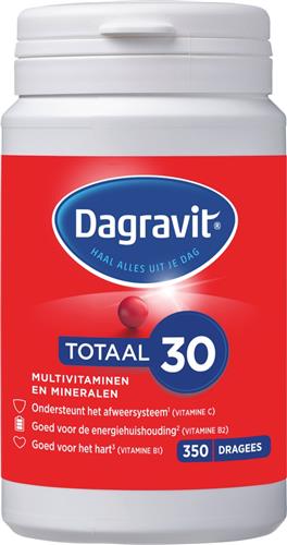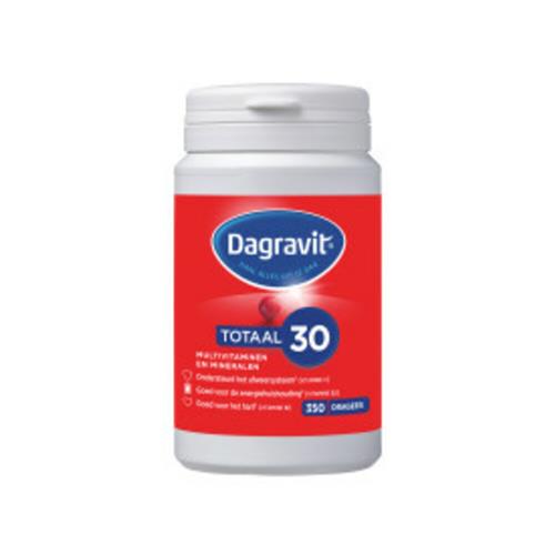 De Dagravit Totaal 30 Multivitaminen bevatten onder andere vitamine A, C en het mineraal selenium, die bijdragen aan het versterken van onze afweer. Daarnaast zijn vitamine B1, B2, B3, B5, B6, B12 en het mineraal koper aanwezig om een goede energiehuishouding te ondersteunen. Bovendien heeft vitamine B1 een gunstig effect op ons hart. Met een dagelijkse dosis van 1 tot 3 dragees voor volwassenen en 1 dragee voor kinderen van 4 tot 12 jaar, zorg je voor een optimale aanvulling van vitaminen en mineralen.