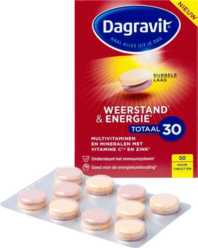 - Bij Bol.com kun je Dagravit Totaal 30 Weerstand & Energie Multivitaminen - Vitamine C, selenium en zink ondersteunen het immuunsysteem - 50 kauwtabletten kopen voor de prijs van € 11,95. Dit is vandaag de goedkoopste webshop.