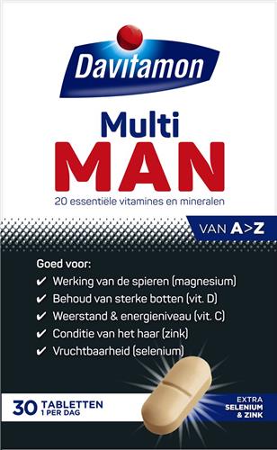 - Bij Bol.com kun je Davitamon Multi Man - met extra selenium en zink - multivitaminen man - 30 tabletten kopen voor de prijs van € 14,78. Dit is vandaag de goedkoopste webshop.