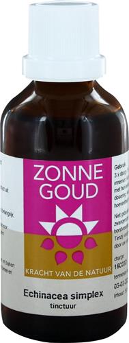 De Zonnegoud Echinacea simplex tinctuur is een kruidenpreparaat met als ingrediënten water, alcohol (50% vol.) en extract uit de Zonnehoed. Dit supplement is bedoeld om 3 maal daags 15 tot 20 druppels met water in te nemen. Voor kinderen geldt een dosering die overeenkomt met hun leeftijd. Het wordt afgeraden dit product te gebruiken tijdens de zwangerschap of borstvoeding, tenzij voorgeschreven door een voorschrijver.