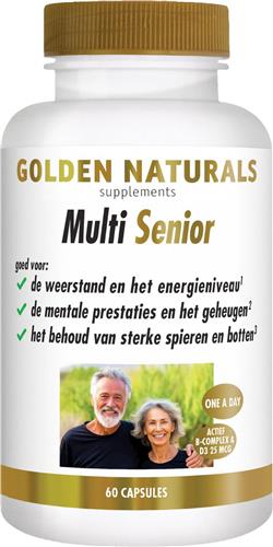 - Bij Bol.com kun je Golden Naturals Multi Senior (60 vegetarische capsules) kopen voor de prijs van € 26,69. Dit is vandaag de goedkoopste webshop.