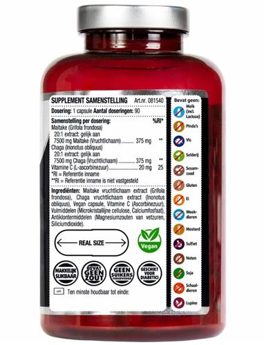 | Ingrediënten | Samenstelling per 1 capsule%RI*Maitake (Grifola frondosa) 20:1 extractGelijk aan 7500 mg-Maitake (Vruchtlichaam)375 mg-Chaga (Inonotus obliquus) 20:1 extractGelijk aan 7500 mg-Chaga (Vruchtlichaam)375 mg-Vitamine C (L-ascorbinezuur)20 mg25%*RI = Referentie innameIngrediëntenMaitake vruchtlichaam extract (Grifola frondosa), Chaga vruchtlichaam extract (Inonotus obliquus), Vegan capsule, Vitamine C (Ascorbinezuur), Vulmiddelen (Microkristallijne cellulose, Calciumfosfaat), Antiklontermiddelen (Magnesiumzouten van vetzuren, Siliciumdioxide).AllergeneninformatieBevat geen melk (incl. lactose), pinda's, vis, selderij, sesamzaad, gluten, ei, weekdieren, mosterd, sulfiet, noten, soja, schaaldieren, lupine, zout. Vegan. |
