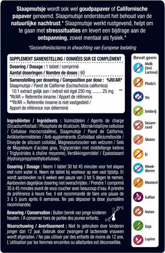 | Gebruiksaanwijzing | Neem 1 tablet 30 tot 45 minuten voor het slapen met ruim water in. Neem de tablet bij voorkeur op een vast tijdstip. Er wordt aanbevolen na 6 weken een pauze van 3 tot 5 dagen te nemen. Aanbevolen dagelijkse dosering niet overschrijden. |