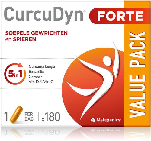 De Metagenics CurcuDyn Forte is een complete formule die speciaal is ontwikkeld voor soepele gewrichten, spieren en kraakbeen. Dankzij de unieke combinatie van curcuma, boswellia, gember, vitamine C en D zorgt deze formule voor langdurige ondersteuning van het bewegingsstelsel. De verlengde afgifte van curcuma en boswellia zorgt ervoor dat de CurcuDyn Forte gedurende de dag effectief blijft werken. Bovendien is deze formule geschikt voor vegetariërs en biedt Metagenics goed opneembare kurkuma aan.