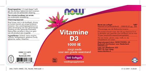 - Bij Bol.com kun je Now Foods - Vitamine D3 1000 IU - Belangrijk voor Immuunsysteem en Spierwerking - 360 Softgels kopen voor de prijs van € 20,46. Dit is vandaag de goedkoopste webshop.