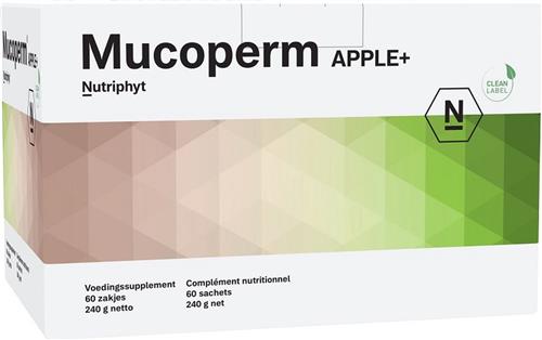 Nutriphyt Mucoperm Apple+ wordt geproduceerd door Nutriphyt en elke verpakking bevat 60 zakjes. Het supplement is veganistisch, afkomstig uit Europa, en dient droog en op kamertemperatuur bewaard te worden. Raadpleeg een deskundige alvorens dit supplement te gebruiken, vooral bij zwangerschap, lactatie, medicijngebruik en ziekte.