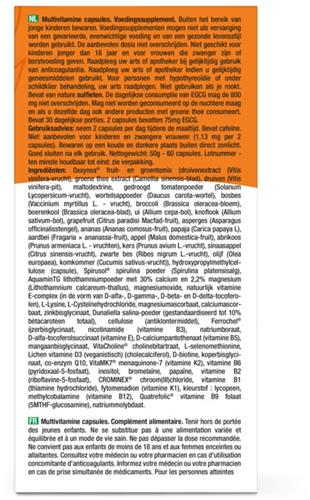 | Ingrediënten | Oxxynea® fruit- en groentemix (druivenextract (Vitis vinifera-vrucht), groene thee extract (Camellia sinensis-blad), druiven (Vitis vinifera-pit), maltodextrine, gedroogd tomatenpoeder (Solanum Lycopersicum-vrucht), wortelsappoeder (Daucus carota-wortel), bosbes (Vaccinium myrtillus L. - vrucht), broccoli (Brassica oleracea-bloem), boerenkool (Brassica oleracea-blad), ui (Allium cepa-bol), knoflook (Allium sativum-bol), grapefruit (Citrus paradisi Macfad-fruit), asperges (Asparagus officinalisstengel), ananas (Ananas comosus-fruit), papaja (Carica papaya L), aardbei (Fragaria × ananassa-fruit), appel (Malus domestica-fruit), abrikoos (Prunus armeniaca L. - vruchten), kers (Prunus avium L.-vrucht), sinaasappel (Citrus sinensis-vrucht), zwarte bes (Ribes nigrum L.-vrucht), olijf (Olea europaea), komkommer (Cucumis sativus-vrucht)), hydroxypropylmethylcellulose (capsule), Spirusol® spirulina poeder (Spirulina platensisalg), AquaminTG lithothamniumpoeder met 30% calcium en 2,2% magnesium (Lithothamnium calcareum-thallus), magnesiumoxide, natuurlijk vitamine E-complex (in de vorm van D-alfa-, D-gamma-, D-beta- en D-delta-tocoferolen), L-Lysine, L-Cysteïnehydrochloride, magnesiumascorbaat, calciumascorbaat, zinkbisglycinaat, Dunaliella salina-poeder (gestandaardiseerd tot 10% bètacaroteen totaal), cellulose (antiklontermiddel), Ferrochel® ijzerbisglycinaat, nicotinamide (vitamine B3), natriumboraat, D-alfa-tocoferolsuccinaat (vitamine E), D-calciumpantothenaat (vitamine B5), mangaanbisglycinaat, VitaCholine® cholinebitartraat, L-selenomethionine, Lichen vitamine D3 (veganistisch) (cholecalciferol), D-biotine, koperbisglycinaat, co-enzym Q10, VitaMK7® menaquinone-7 (vitamine K2), vitamine B6 (pyridoxaal-5-fosfaat), inositol, bromelaïne, papaïne, vitamine B2 (riboflavine-5-fosfaat), CROMINEX® chroom(III)chloride, vitamine B1 (thiamine hydrochloride), fytomenadion (vitamine K1), kleurstof : lycopeen, natriummolybdaat, methylcobalamine (vitamine B12), Quatrefolic® vitamine B9 folaat (5MTHF-glucosamine). Bevat van nature SULFIET. |