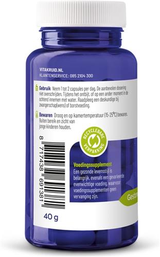 | Gebruiksaanwijzing | Neem 1 tot 2 capsules per dag. Tenzij anders geadviseerd. Tijdens het ontbijt, of op een ander moment in de ochtend innemen met water. Raadpleeg een deskundige bij zwangerschap(wens) of borstvoeding. Aanbevolen dosering niet overschrijden. |