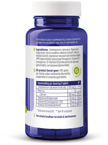 Vitakruid Osta K2 & D3 Algae is hét voedingssupplement voor het behoud van sterke botten en een goede botaanmaak. Deze formule speelt een essentiële rol bij het bevorderen van een gezonde kalkhuishouding. De vitamines zijn van nature rijk aan calcium, magnesium, silicium en strontium, waardoor je lichaam op natuurlijke wijze wordt ondersteund. Bovendien worden de best opneembare vormen van vitamine K2 (MK-7) en D3 gebruikt, wat zorgt voor een optimale opname in het lichaam.