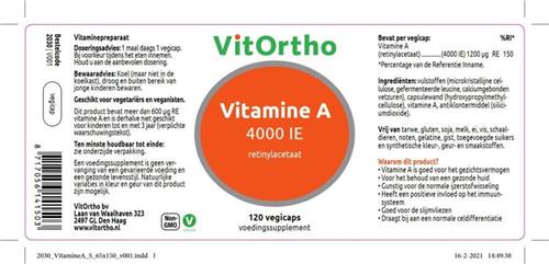 Controleer altijd voor aankoop de specificaties op de website van de webwinkel waar je Vitortho Vitamine A 4000 IE 120 capsules aankoopt